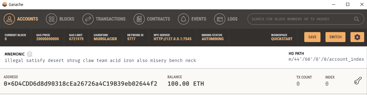 ๋จผ์ ์ด์ ์ ์ค์นํด๋ Ganache ๋ฅผ ์คํํด์ฃผ๊ณ , test net ์ ๋ง๋ค์ด์ค๋๋ค. (์ ์ ๊ฒฝ์ฐ, QuickStart ๋ก ๋ง๋ค์ด์ฃผ์์ต๋๋ค)