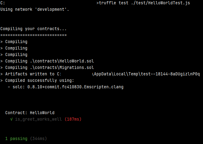 var hello = artifacts.require("HelloWorld") contract("HelloWorld", function () { it ("is_greet_works_well", async function () { const instance = await hello.deployed(); const response = await instance.greet(); assert.equal(response, "Hello World", "greeting message is wrong"); }) })- var hello = artifacts.require("HelloWorld"): HelloWorld contract λ₯Ό κ°μ Έμ΅λλ€.