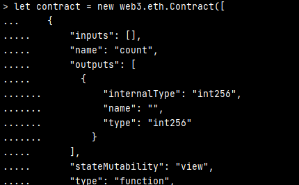 $ node > const Web3 = require('web3') > const web3 = new Web3('https://ropsten.infura.io/v3/{PROJECT_ID}') > let contract = new web3.eth.Contract([ { "inputs": [], "name": "count", "outputs": [ { "internalType": "int256", "name": "", "type": "int256" } ], "stateMutability": "view", "type": "function", "constant": true }, ], "0x99AF...")- μνλ λΈλ‘μ²΄μΈ λ€νΈμν¬λ‘ web3 κ°μ²΄λ₯Ό λ§λ€μ΄μ€λλ€. μ¬κΈ°μλ ropsten μ μ¬μ©ν κ²μ΄λ―λ‘, PROJECT_ID λ‘ endpoint λ₯Ό μ§μ νμ¬ μ€μ ν΄μ£Όμμ΅λλ€.