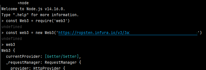 $ npm install web3κ·Έ ν node λ₯Ό μ€νμν¨ λ€μ infura PROJECT ID λ‘ web3 κ°μ²΄λ₯Ό λ§λ€μ΄μ€λλ€.