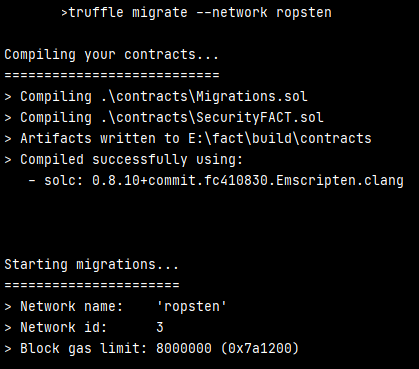 $ truffle console --network ropsten truffle(ropsten)> web3.eth.getBalance("{ADRRESS}") '999374614924453492'μ΄λλ₯Ό μ±μμ£Όλ©΄ λ€μκ³Ό κ°μ΄ migrate λ₯Ό μνν μ μμ΅λλ€.