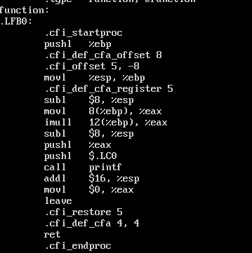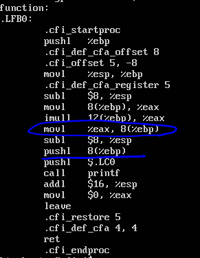 .file "example4.c" .section .rodata .LC0: .string "result : %d\n" .text .globl function .type function, @function function: .LFB0: .cfi_startproc pushq %rbp .cfi_def_cfa_offset 16 .cfi_offset 6, -16 movq %rsp, %rbp .cfi_def_cfa_register 6 subq $16, %rsp movl %edi, -4(%rbp) movl %esi, -8(%rbp) movl -4(%rbp), %eax imull -8(%rbp), %eax movl %eax, %esi movl $.LC0, %edi movl $0, %eax call printf leave .cfi_def_cfa 7, 8 ret .cfi_endproc .LFE0: .size function, .-function .globl main .type main, @function main: .LFB1: .cfi_startproc pushq %rbp .cfi_def_cfa_offset 16 .cfi_offset 6, -16 movq %rsp, %rbp .cfi_def_cfa_register 6 subq $16, %rsp movl $50, -8(%rbp) movl $60, -4(%rbp) movl -4(%rbp), %edx movl -8(%rbp), %eax movl %edx, %esi movl %eax, %edi call function movl $0, %eax leave .cfi_def_cfa 7, 8 ret .cfi_endproc .LFE1: .size main, .-main .ident "GCC: (Ubuntu 4.8.4-2ubuntu1~14.04.1) 4.8.4" .section .note.GNU-stack,"",@progbits์ด๋ฒ์๋ ์๋ก์ด ํจ์ function ์ด ๋ฑ์ฅํ๋ค.