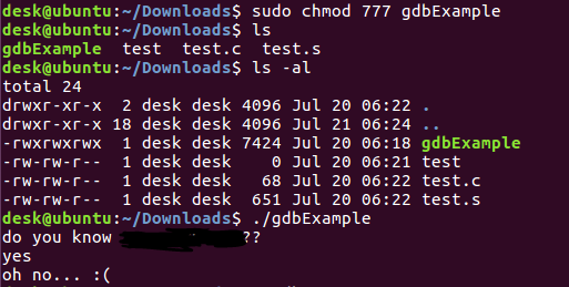 gdb λͺ λ Ήμ΄λ‘ step (λ€μμΌλ‘ λμ΄κ°) νκ³ continue λ₯Ό νλ μμλ "oh no... :(" κ° μΆλ ₯λ¨μ νμΈνμλ€.