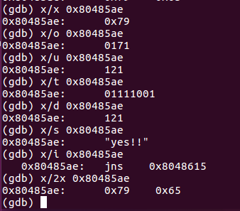 x Hexadecimal format o Octal format u Unsigned decimal format t Binary format d Decimal format s string i CPU instruction Nx examine N words form stack string λͺ λ Ήμ΄λ‘ μ μ£Όμ (0x80485ae) μ μλ κ°μ μ΄ν΄λ³΄κΈ°λ‘ νλ€.